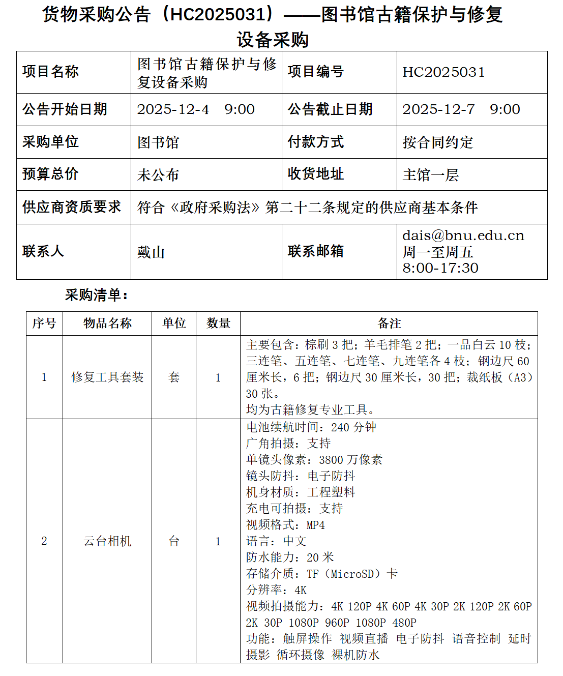货物采购公告(HC2025031)——图书馆古籍保护与修复设备采购
