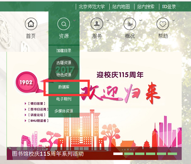 1.输入http://www.lib.bnu.edu.cn,进入北京师范大学图书馆网站首页,选择右上角的“资源”,在下拉菜单中选择“数据库”