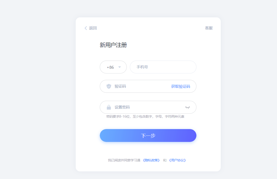 1.在登录模块点击【新用户注册】,输入您的手机号、手机验证码、设置您的登录密码后,点击【下一步】